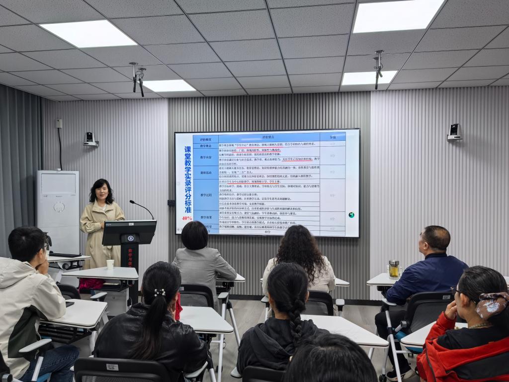 报告会上,田苗老师以《赛场砺剑,课堂深耕——教学创新实践与反思》为题,从教学创新的内涵出发,指出教学创新应立足学校办学定位,以解决教学真实问题为导向,系统培养学生自主学习与创新思维能力。她详细解读了全国高校教师教学创新大赛的赛制变化与评审标准,强调课程思政、产教融合、人工智能融合等新赛道的重要性。田老师还结合数学类课程的教学实践,展示了如何通过“积微成著”的教学设计,将抽象概念与生活实际相结合,如“半亩塘周长计算”“玻璃幕墙面积估算”等案例,生动体现了数学在科研与实践中的广泛应用,实现了知识传授与价值引领的有机统一。
